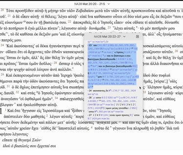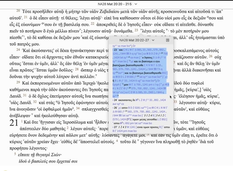 On this picture you have a snapshot of this text, called NA28 (short for Nestle /Aland version 28) - looking at Matthew 20:23. Take a closer look at the blue highlighted area. The black greek words are the greek words the Text Critics have selected. Arbitrarily, based on their own made up guidelines. The blue numbers, letters or symbols refers to the Manuscripts they have selected for their support.
