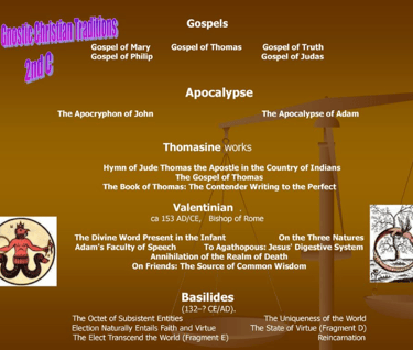 Not only did the Gnostics corrupt many readings found in the New Testament, but offered their own writings as inspired scriptures, such as the The Gospel of Thomas, The Gospel of Peter, The Gospel of Philip, The Gospel of Judas, The Gospel of the Ebionites, The Gospel of The Twelve, The Gospel According To The Hebrews (also called The Gospel According To Matthew, not to be confused with the real Gospel of Matthew), The Gospel According to the Egyptians, The Gospel of Mary (Magdalene), The Acts of Andrew, The Acts of Peter, The Acts of John, etc. Gnosticism had a variety of forms and sects, which broadened its base and growth. Historian Will Durant calls Gnosticism "the quest of godlike knowledge (gnosis) through mystic means" Durant is correct. Gnosticism is thinly veiled Pantheism. Pantheism is the doctrine that identifies God with and in the whole universe, every particle, tree, table, animal, and person being are part of GOD. Or, to explain it in a very basic way, the Greek word pan = all.The Greek word theos = God). Therefore it literally means "God is All" and "All is God".