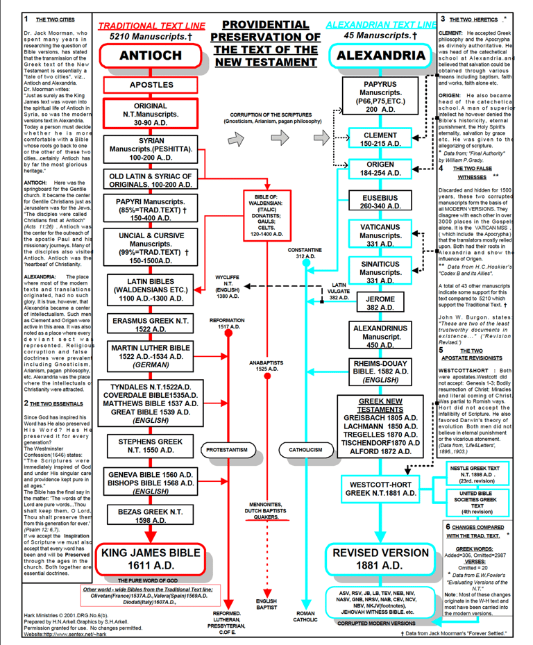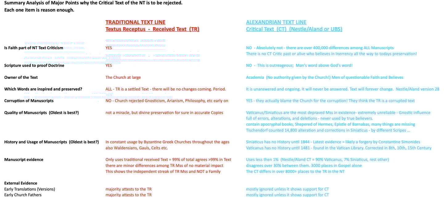 Reject the very recent - always changing - Line of corrupted Manuscripts (Alexandrian). This Text mainly uses 2 highly corrupted Manuscripts which greatly disagree with each other and the Traditional Line. All the missing Words and Sentences in modern Bibles - and there are many of them - come from this Line