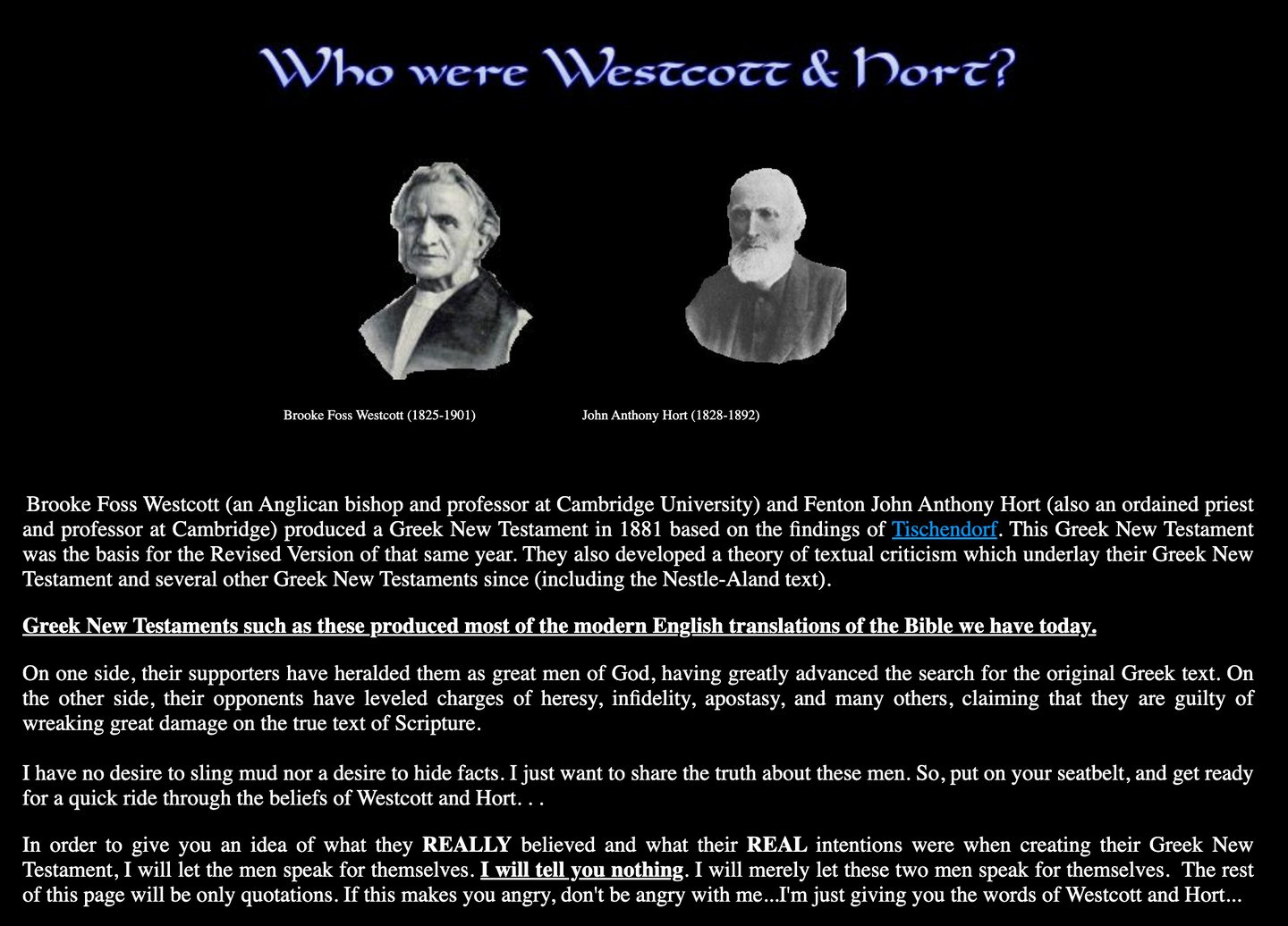 In the 1870's, a challenge arose in the English world to the primacy of the King James Bible. There had always been a challenge from Roman Catholicism, but this challenge came from men who were officially Protestants: Church of England Bishop Brooke Foss Westcott and Cambridge University Professor Fenton John Anthony Hort.